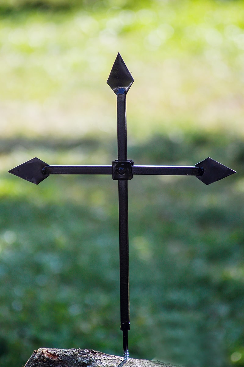 Kézzel megmunkált fémkereszt – fényes fekete lakkal bevonva, védve így a rozsda ellen.