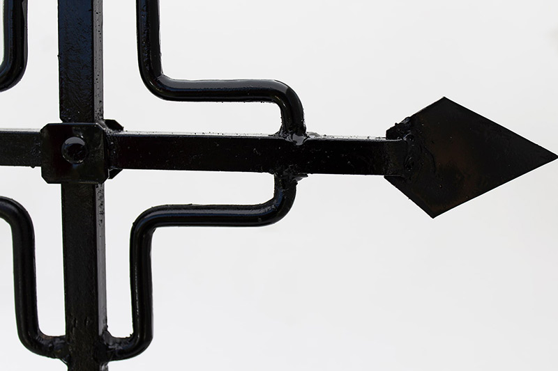 Kézzel megmunkált kovácsolt vaskereszt, fényes fekete lakkal bevonva, védve így a rozsda ellen.